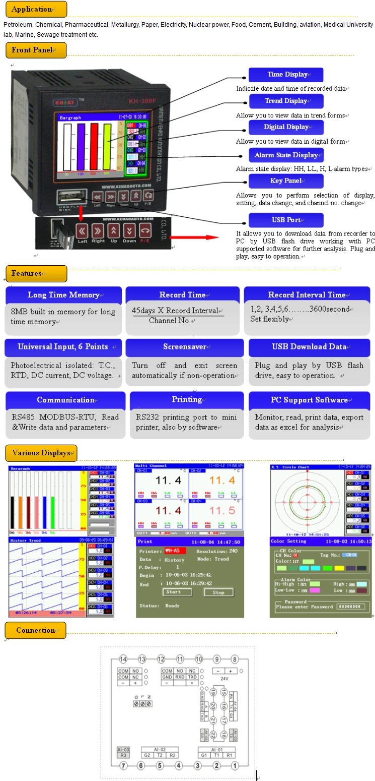KH300GF mini color paperless recorder (72x72x110mm , up to 4 channels) is TFT true color LCD display; completely isolated universal input such as thermocouple, thermal resistance, current and voltage, adopts modular structure output functions such as alarm, auxiliary power supply for sensors output, retransmission, print and communication etc. Measuring data can be displayed in various types, such as graphic display as bar-graph, real-time trending, history trending memory, real time circular chart, history circular chart memory and alarming state display; also can be printed in curve and data by mini printer through RS232 port. At the same time, it also provides features to check the data’s of year, month, day, hour, minute, second directly. Recorder can be configuration with OPC server, SCADA system and other professional software with MODBUS-RTU communication protocol through RS485 port. The history data can be downloaded directly by USB flash drive, plug and play, easy and flexible. PC supported data analysis software can print the data in curve and output Excel format for further analysis.
