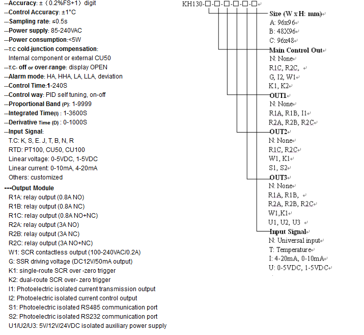 KH130 is a intelligent bargarph PID process controller, intelligent PID self-tuning, on-0ff and automatic PID control shifted flexibly, high-accuracy measurement and data acquisition compatible; universal input such as thermocouple, thermal resistance, current and voltage, can measure accurately and control temperature, pressure, liquid level, gravity, instantaneous flow and others; adopts SMT technology, modular structure output functions such as relay, SSR, SCR, auxiliary power supply for sensors output, retransmission, print and communication etc, easy and flexible to configuration. The alarm output can be set as HA, HHA, LA, LAA flexibly. Modern universal MODBUS communication protocol is available for remote communication with maximum baud rate 19200 bit/s.