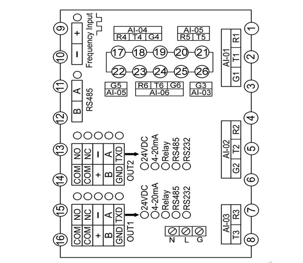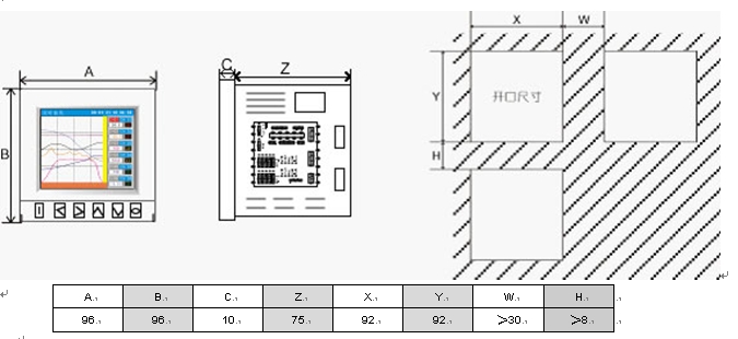 u 測量精度:±(0.2%FS+1)個字 u 電源電壓: AC85-240V、DC110V、DC24V u 顯 示:3.2寸TFT彩色320×240點陣 u 帶流量累積 ◆ 輸入規格: 熱電偶:K、S、N、E、J、T、B、R、Wer526/523 熱電阻:PT100、CU50、CU100 線性電壓:0-5V、1-5V、0-10V、0-20mV...... 線性電流:4-20mA、0-10mA...... 脈沖輸入:訂貨時須知脈沖大小 其它輸入:R、WRe526、mV、其它 ◆ 輸出規格: 變送輸出:4-20mA、0-10V......(最多2路) 繼 電 器:R2A、R2B、R2C(最多2路) 饋 電:U1/U2/U3(最多2路) 打印/通訊接口:S1、S2、P USB接口:U u 記錄時間: 記錄間隔可任意設1、2、3、4、5、6、 7、8……秒。 八筆記錄:360天 (記錄間隔1分鐘) u 斷電保護時間: 用FLASH MEMORY保存設置參數和歷史 數據,斷電后永久保存,采用硬件時鐘, 掉電后也能準確運行。 u 環境溫度:-20-50℃ u 環境濕度:0-85%RH ◆ 外形尺寸:96×96×85mm u 安裝尺寸:92×92×75mm |