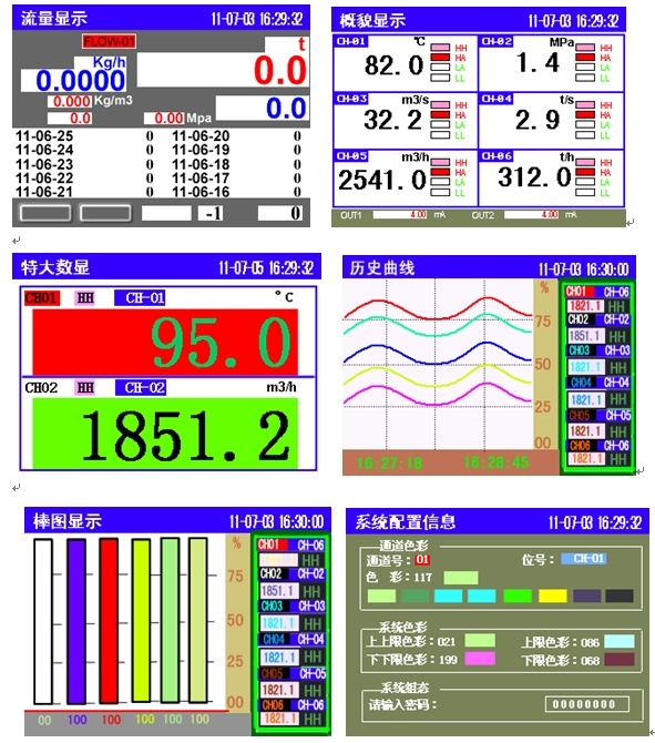 KH300AL小型彩色流量積算無紙記錄儀(96×96mm最多6通道輸入)具有全隔離輸入,可與電磁、渦街、孔板、渦輪等多種流量計配套,根據天然氣的摩爾組分,管道的溫度和壓力實時在線計算天然氣的超壓縮系,將流體流量自動補償為工業標準狀態(20℃、0.101325MPa)下的體積流量(智能溫壓補償功能)。支持多回路流量積算,數據處理、流量運算周期小于1秒?商峁┳兯汀⑼ㄓ、打印、報警、饋電等功能,儀表具有強大的顯示功能,高精度棒圖顯示、實時曲線顯示、歷史曲線追憶、報警狀態顯示,同時可直接查詢年、月、日、時、分、秒的數據,快捷方便。使用RS232和RS485通訊以及RS232打印,標準MODBUS-RTU協議,可與組態王、MCGS等專業軟件進行組態。數據可直接通過任意U盤導出,U盤即插即讀,無需任何操作;分析軟件可導出EXCEL數據格式或曲線格式,直接打印即可。